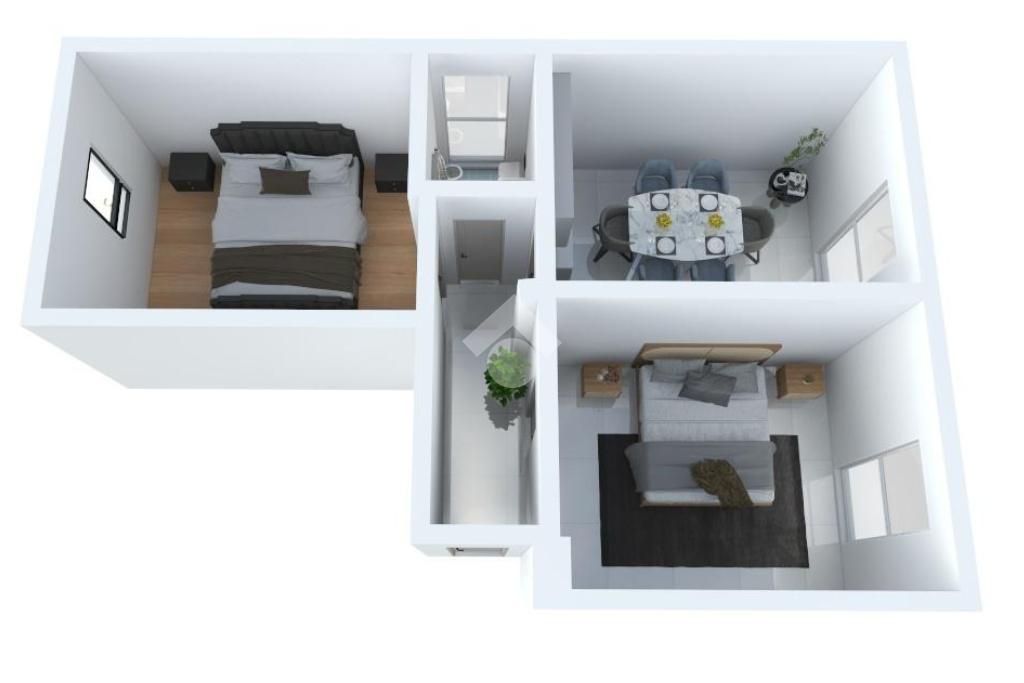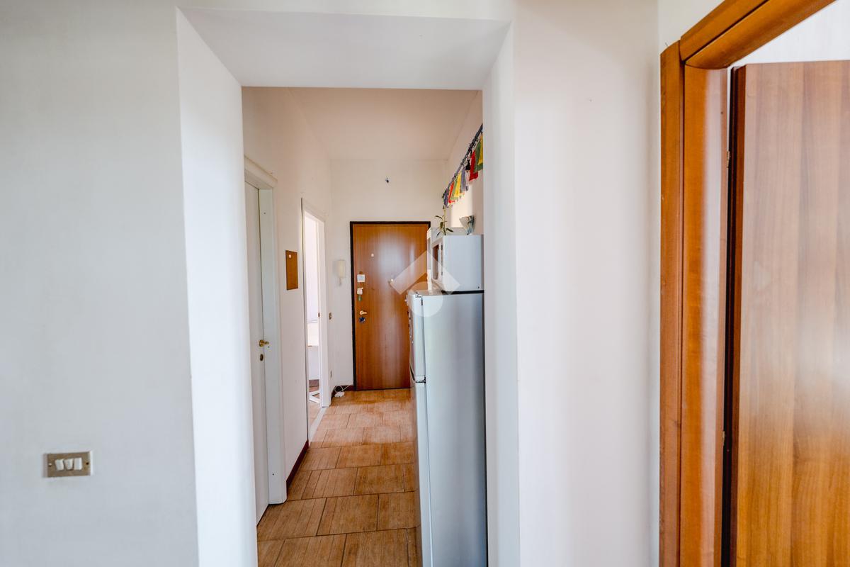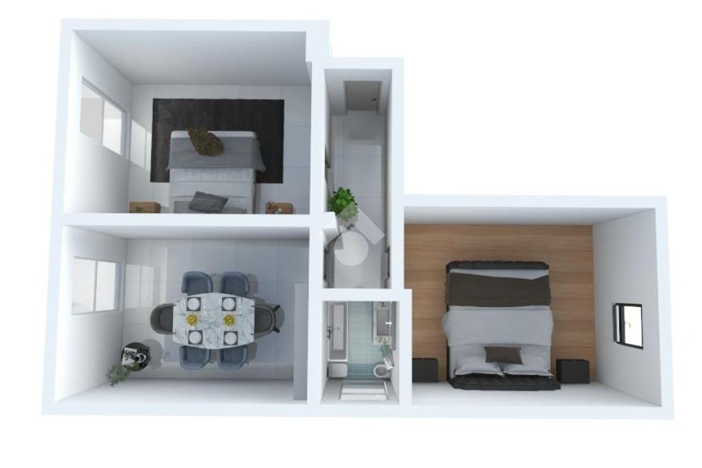 L'appartamento è così composto: ingresso su corridoio con accesso ai vari ambienti, un ampio soggiorno con cucina a vista, due camere da letto matrimoniali e bagno finestrato con vasca. Completa la soluzione la presenza della cantina.